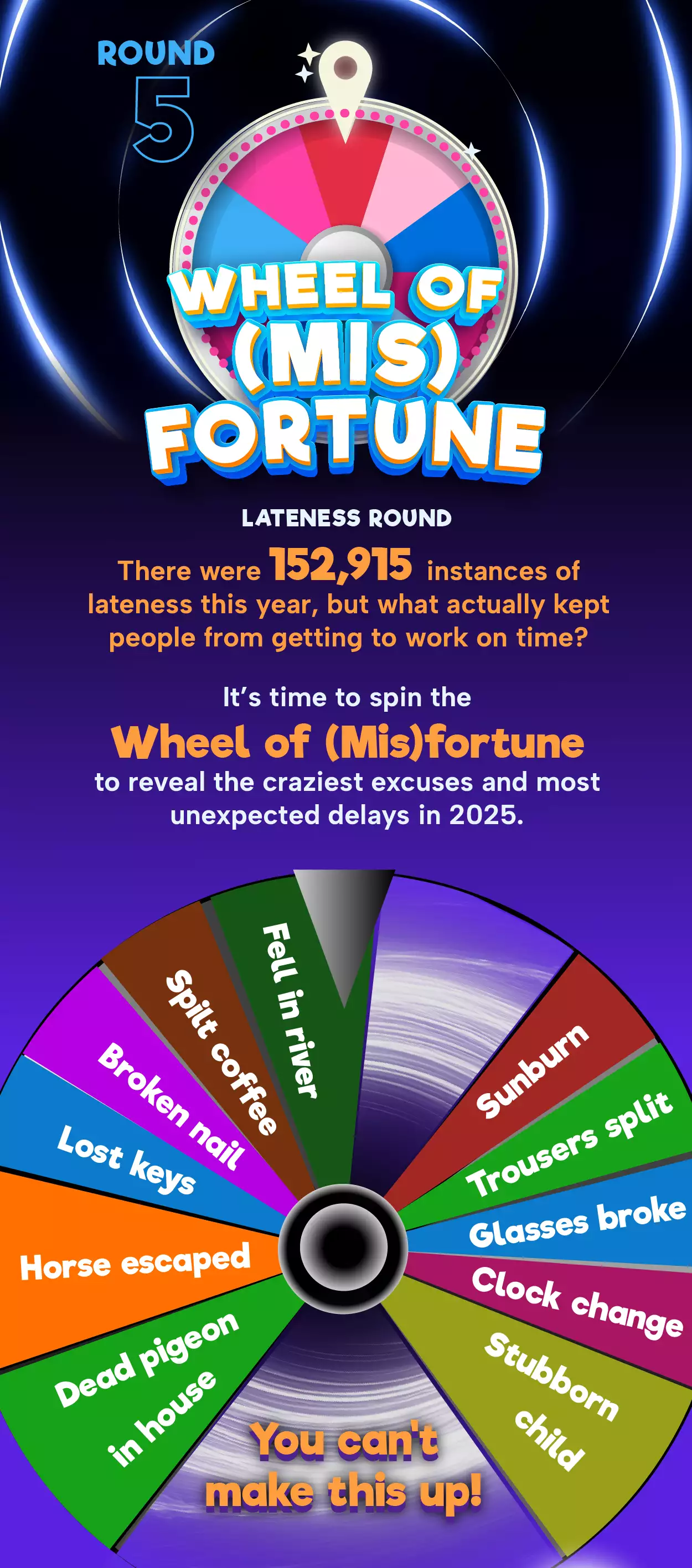 Staff lateness certainly keeps business owners on their toes, especially in busy periods. Our wheel of misfortune can reveal over 150,000 reports of lateness were recorded in the absence management software last year.